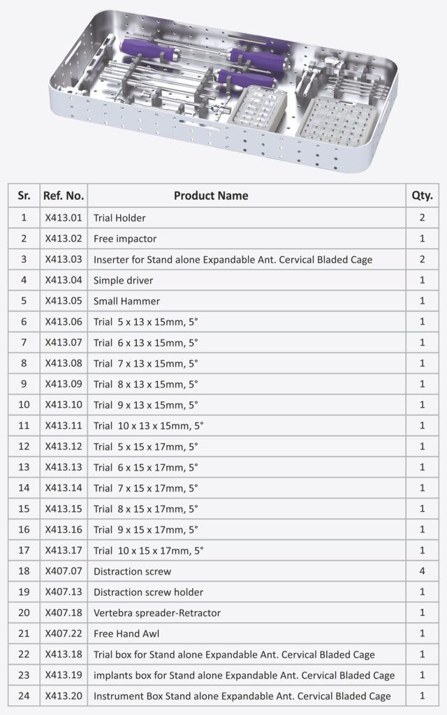 The Stand-Alone Expandable Anterior Cervical Bladed Cage is a next-generation spinal implant designed for Anterior Cervical Discectomy and Fusion (ACDF) procedures. Engineered for superior anatomical fit, this cage combines expandable height technology, integrated anchoring blades, and zero-profile fixation in a single, self-contained device—offering unmatched ease of use, stability, and clinical outcomes.